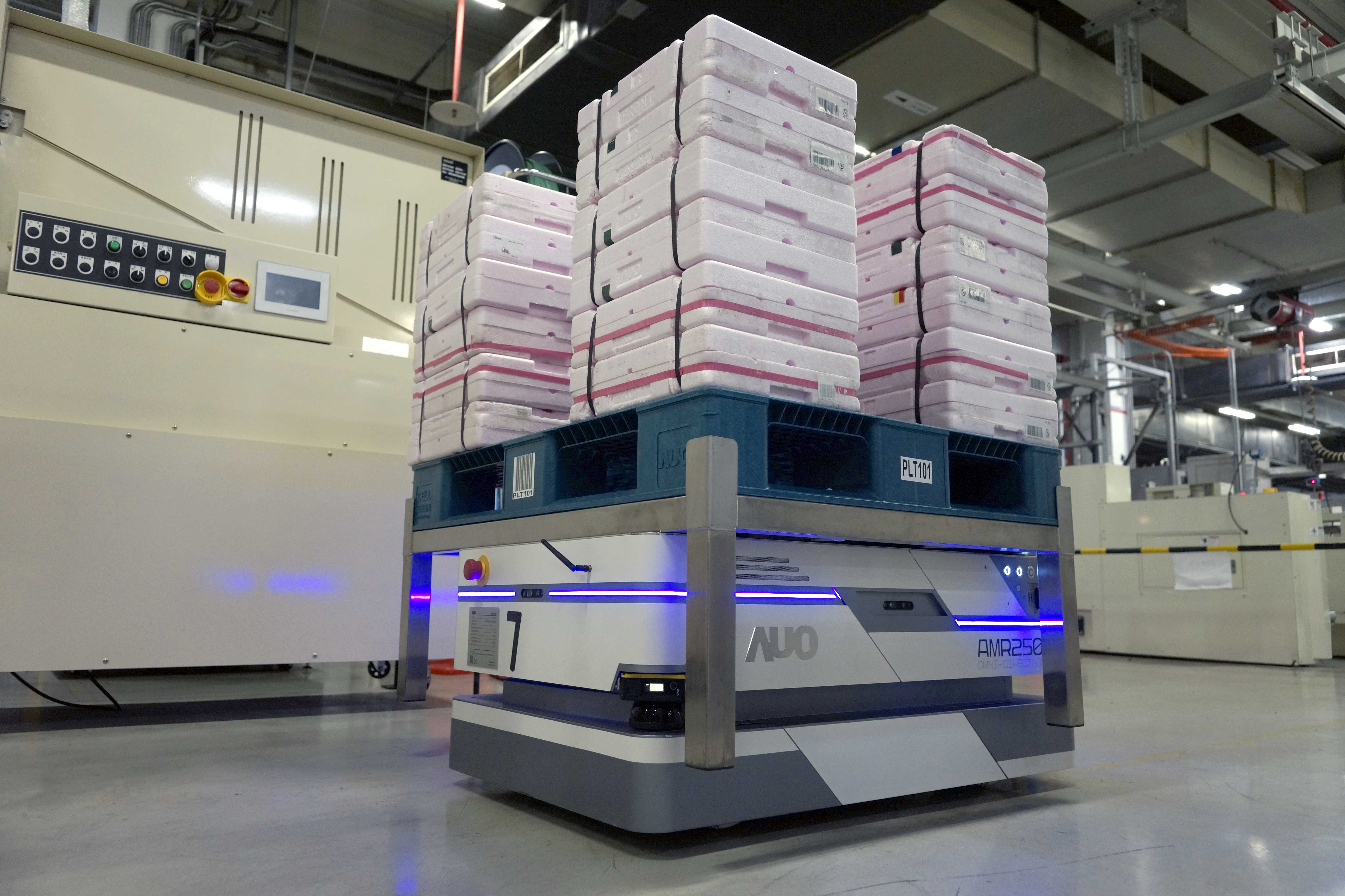 友达运用数字孪生系统,结合AMR无人搬运车进行派送,达成低库存高效率的智能化仓储物流管理。