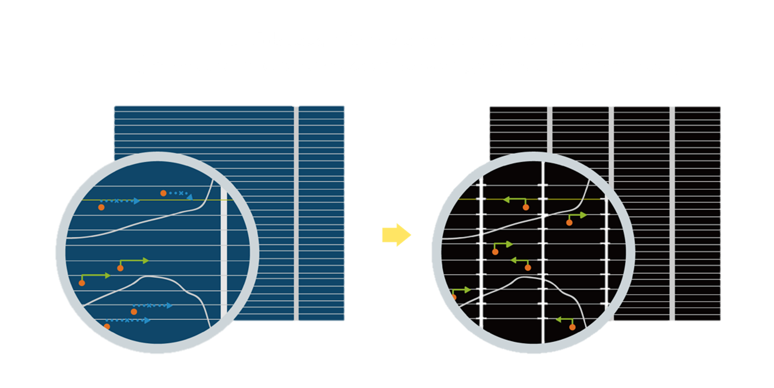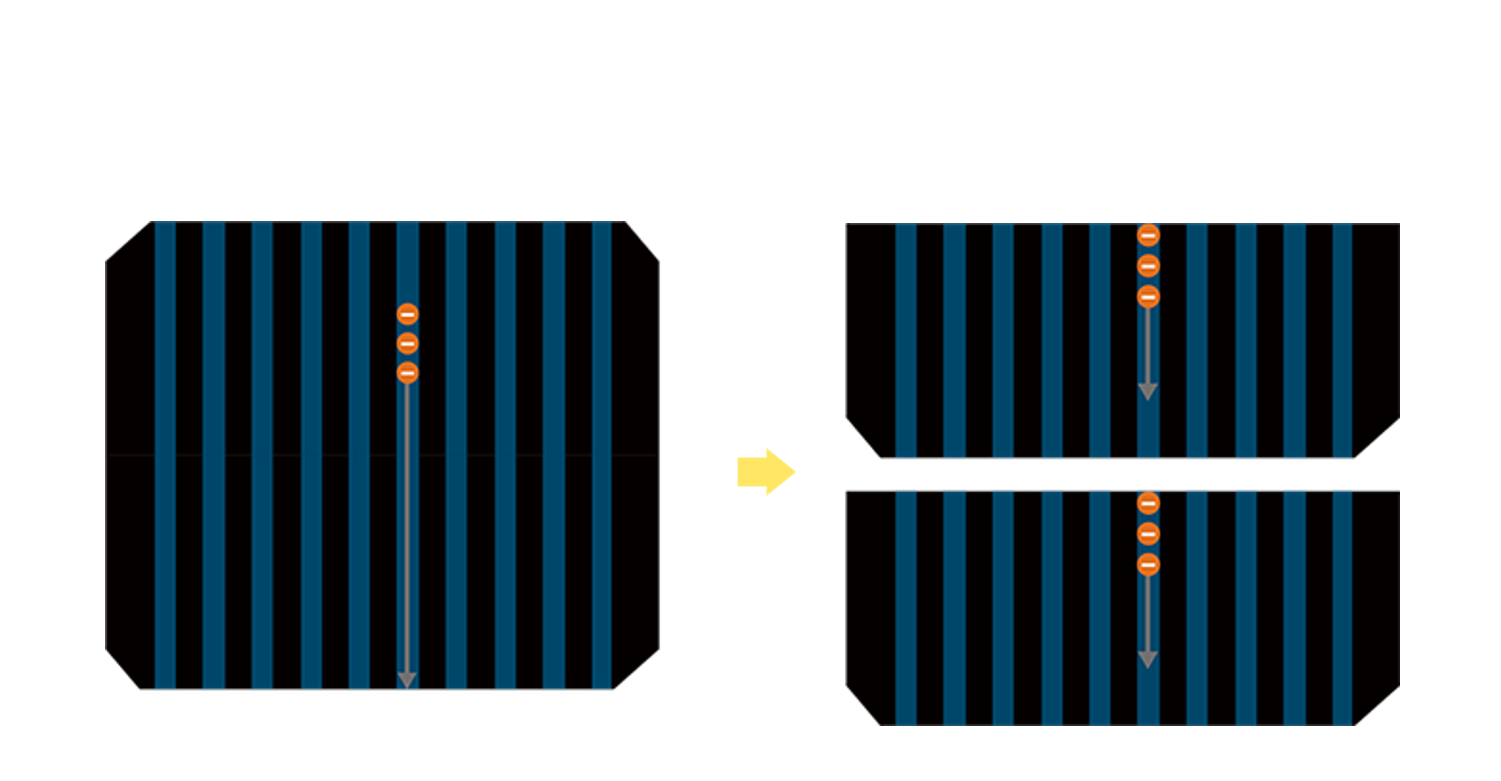 - 結合半切電池,降低遮陰影響、提升模組抗隱裂能力、並減少電阻損耗,進一步提升模組發電效能。