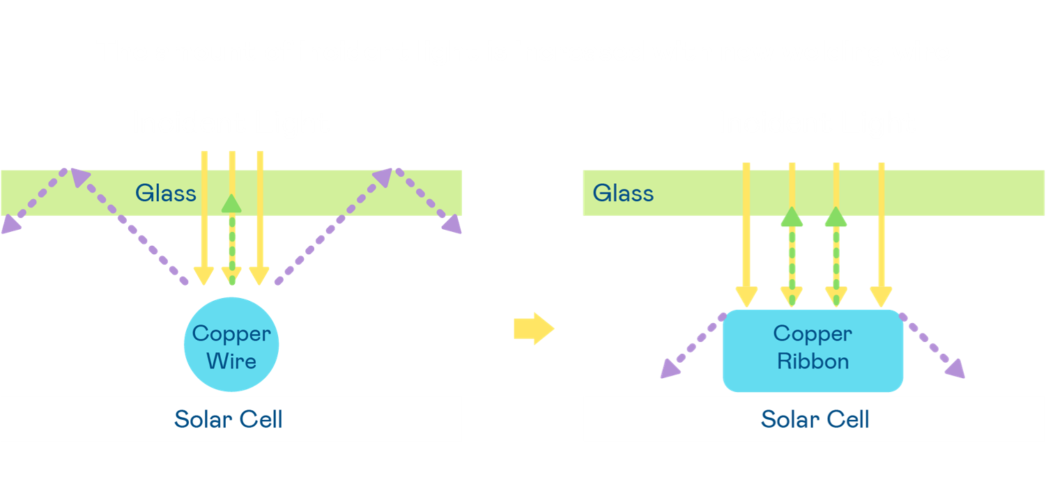 - 電池使用多條銅導線 (Copper wire) 於電池片上形成較短的電流路徑,提高電流收集效率,採用圓形設計的銅導線較傳統扁平式的銅焊帶 (Ribbon),可增加入射至電池的光線量。